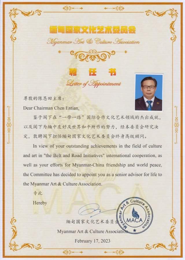 (缅甸国家文化艺术委员会颁发给世界和平丝带组织第一届至第八届委员会主席陈恩田先生的聘书)