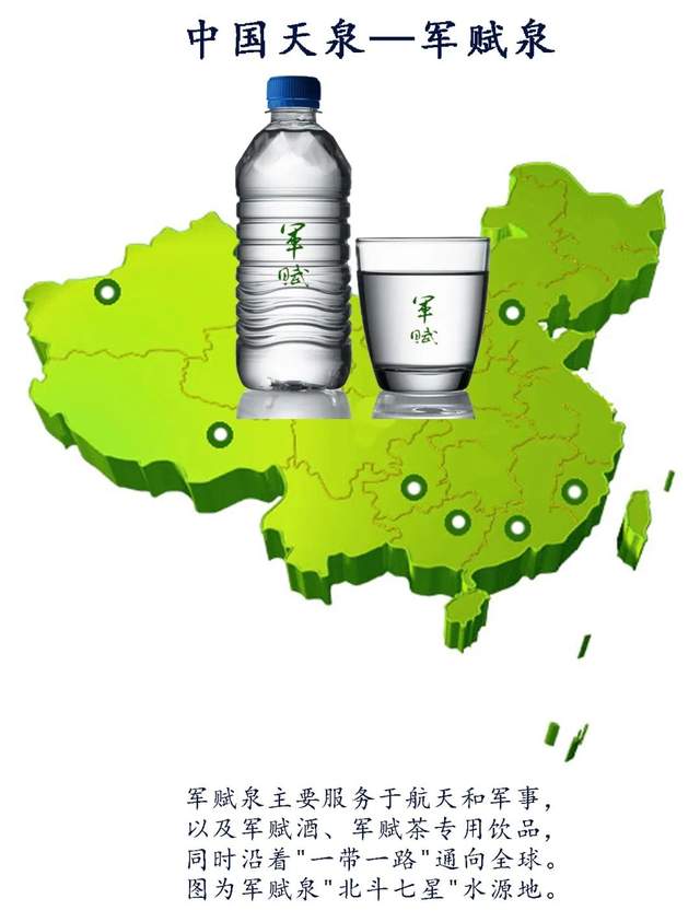 中国天泉“军赋泉”是军赋科技有限公司、绵阳军赋科技有限公司、贵州军赋酒业有限公司、北京军赋书画院等机构联合打造的天然饮用水项目。中国天泉“军赋泉”将在新疆、西藏、贵州、广西、广东、福建、北京等地建立取水基地,主要用于航天、军事、“一带一路”国际活动等专用饮水,同时作为千年军酿“军赋酒”酿造原水、千年军贡“军赋茶”泡制原水等。