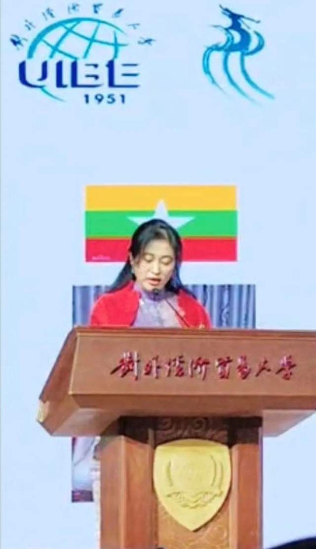 (图为世界和平丝带组织缅甸主席Aye Thinzar Thu在中国对外经济贸易大学发表演讲)