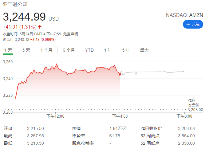 截至昨日美股收盘,米高梅(MGM)涨5.17%,报收41.74美元;亚马逊(AMZN)涨1.31%,报3244.99美元。