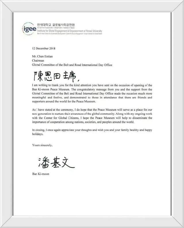 (图为第八届联合国秘书长潘基文先生写给世界和平丝带组织前主席陈恩田先生的亲笔签名信)
