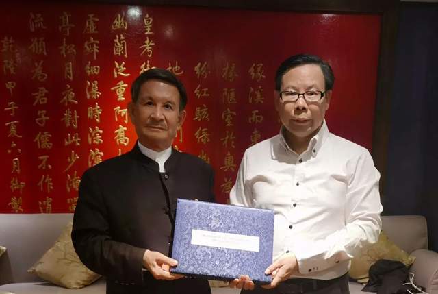 (图为世界和平丝带组织联席会议召集人陈恩田向国际中山会世界总会会长孙武彦赠送“一带一路”国际日蓝皮书)