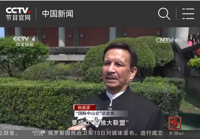 (图为2017年3月,中国中央电视台、福建东南卫视等官方媒体先后报道了孙武彦在台湾成立反独促统大联盟,旗帜鲜明反对台独,促进祖国统一,坚持九二共识,坚持一个中国的原则,公开载明孙武彦为孙中山之孙。)