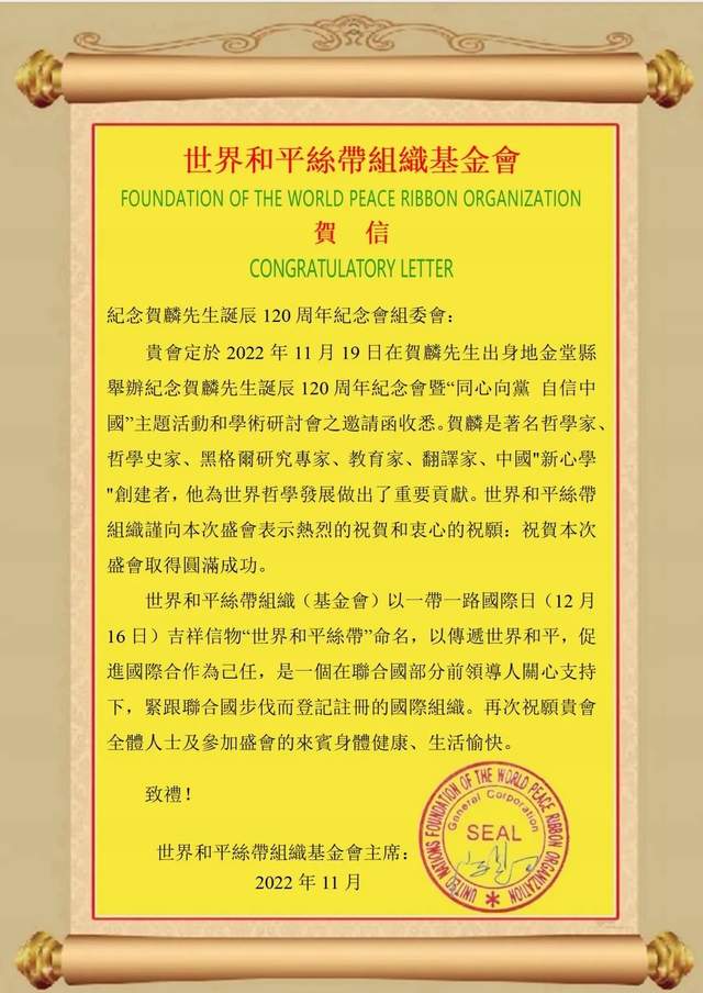 纳斯达克中文台1216国际广播,世界和平丝带组织纽约秘书处消息:2022年11月19日,距离国际民间节日——“一带一路”国际日(12月16日)还有28天。“一代哲儒”贺麟先生诞辰120周年纪念活动在四川.成都.金堂贺麟故居举行。世界和平丝带组织第一届至第八届委员会主席、“一带一路”国际日全球负责人陈恩田受邀出席并发表《让贺麟哲学思想走向世界绽放光芒》的讲话,陈恩田还向组委会递交了世界和平丝带组织的贺信。
