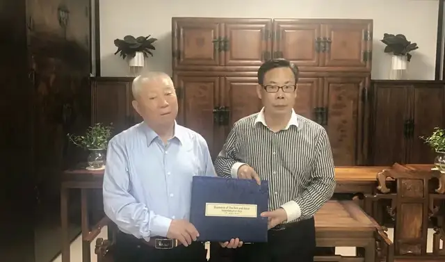 (军赋中文资讯)2021年9月29日,军赋书画院院长陈恩田拜会了长城汽车董事长魏建军之父、著名军旅企业家、保定市企业家协会魏德义会长,双方进行了非常愉快的交流。陈恩田先生目前还担任秘书处位于纽约的世界和平丝带组织联席会议召集人、“一带一路”国际日全球委员会主席、联合国国际茶日基金会联席主席等职,同时兼任中国大陆的军赋科技有限公司董事会召集人。