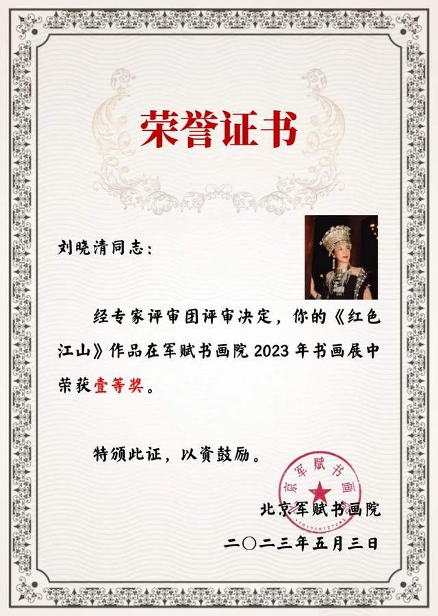 军赋中文资讯,北京当地时间2023年5月3日消息,北京军赋书画院2023年度书画展落下帷幕,获奖作品揭晓,青年画家刘晓清作品《红色江山》荣获一等奖。