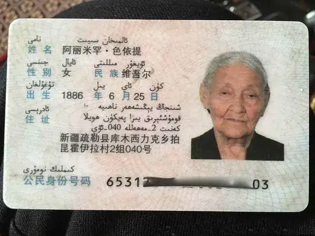 这位老人名叫阿丽米罕·色依提,出生于1886年6月25日(光绪十二年)。她的户籍所在地是新疆维吾尔自治区疏勒县库木西力克乡拍昆吾伊拉村人。