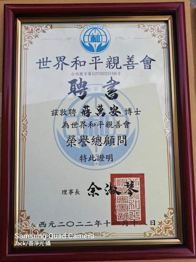 (世界和平亲善会理事长余淑琴敦聘台北市市长蒋万安为荣誉总顾问)