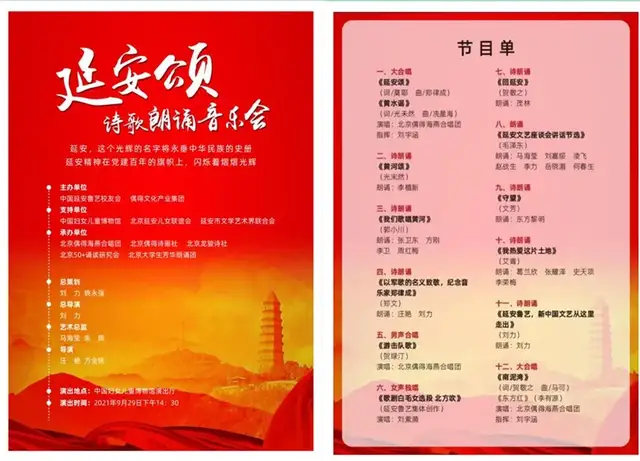 延安颂诗歌朗诵音乐会上演了大合唱《延安颂》、《黄水谣》、歌剧白毛女选段《北风吹》、《南泥湾》和《东方红》等延安时期创作的优秀文艺作品。朗诵了光末然《黄河颂》、郭小川《让我们歌唱黄河》、贺敬之《回延安》、艾青《我热爱这片土地》等著名诗人的代表作。以及讴歌老一辈革命家、艺术家的诗歌《守望》、《以军歌的名义致敬》和《延安鲁艺,新中国的文艺从这里走出》等新作。中国延安鲁艺校友会集体朗诵了毛泽东《在延安文艺作谈会上的讲话》节选部分。